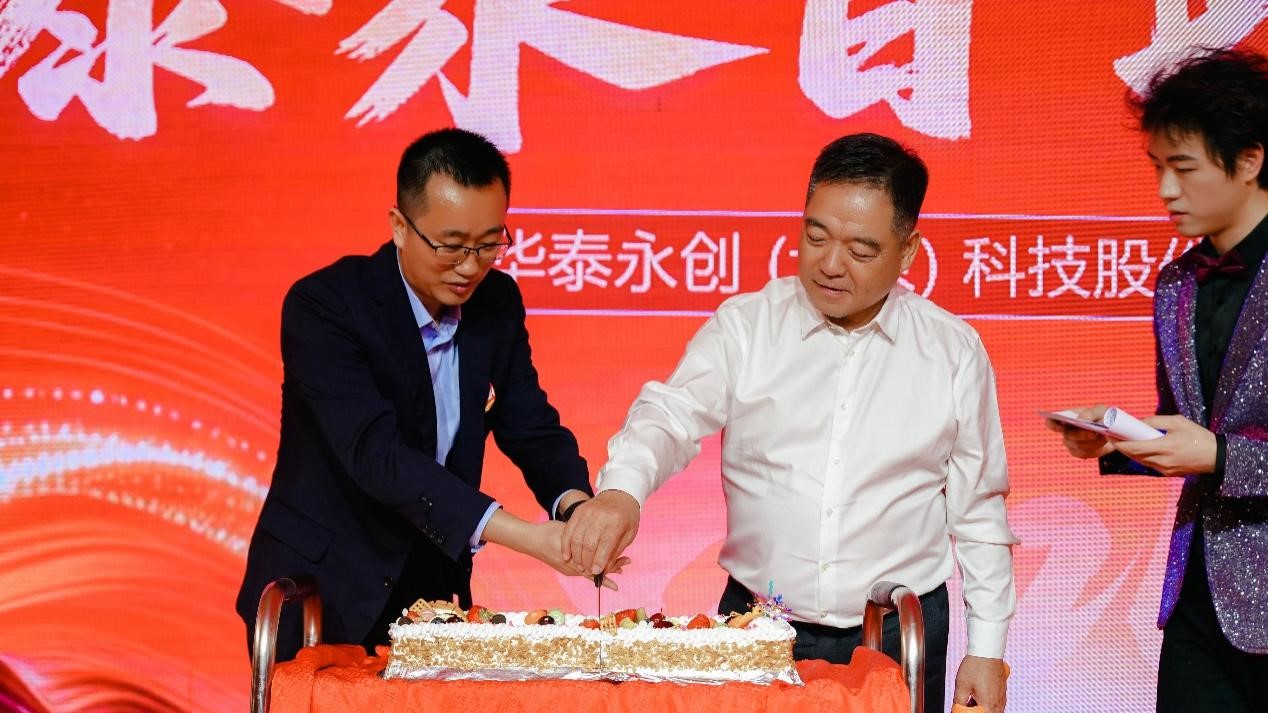 酒香四溢中,舞台氛围再掀高潮。在漫天飞舞的气球与手拧礼花筒的欢腾声中,象征着宏图大展与甜蜜未来的精美长方形巨型蛋糕被推向舞台中央。当天过生日的寿星同事受邀登台,与董事长徐列共同切开这份甜蜜与喜悦。